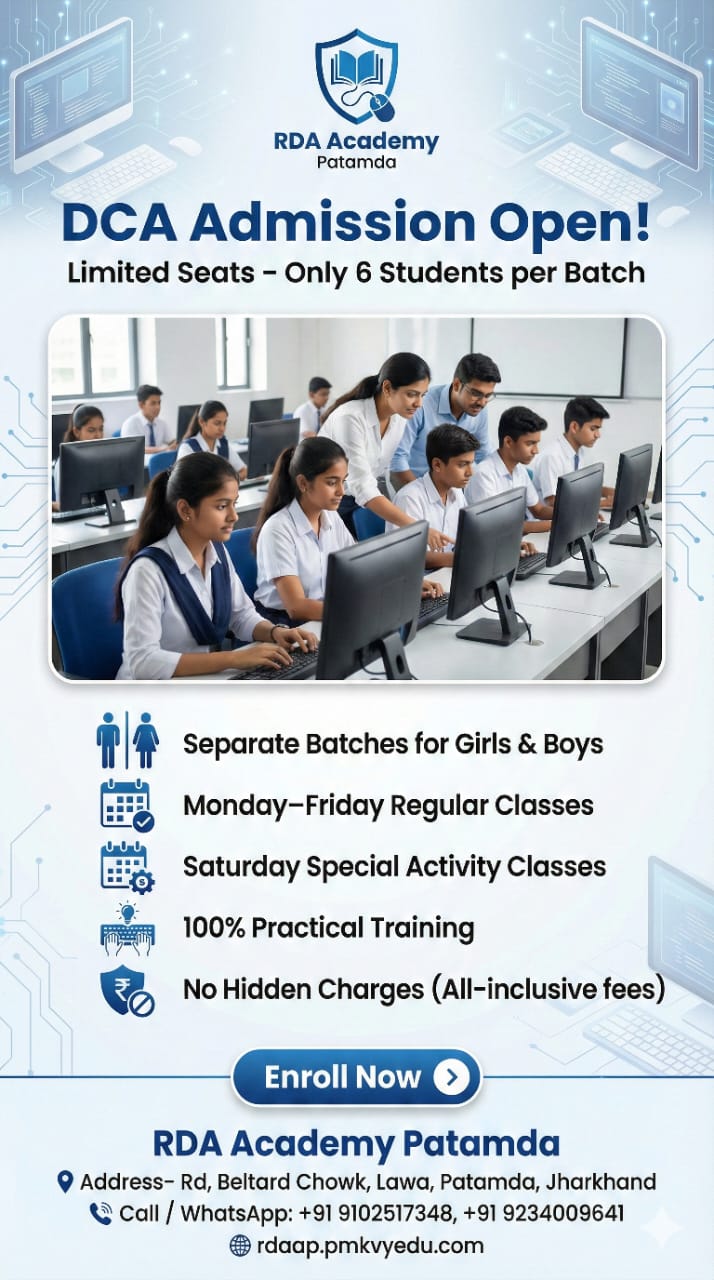 Welcome to RDA ACADEMY PATAMDA, a premier computer coaching institute dedicated to empowering students with essential digital skills. Our mission is to provide high-quality education in computer literacy, programming, software applications, and advanced IT concepts. Whether you are a beginner or looking to enhance your expertise, our well-structured courses, experienced faculty, and hands-on training ensure a comprehensive learning experience.