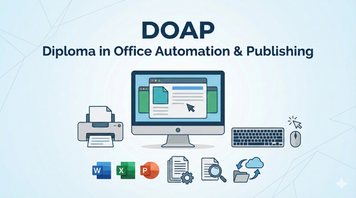The Diploma in Office Automation & Publishing course covers essential office software, MS Office, internet tools, and desktop publishing skills using applications like Photoshop and CorelDRAW. It is ideal for students who want to build practical skills for office work, documentation, and professional design tasks.">">">