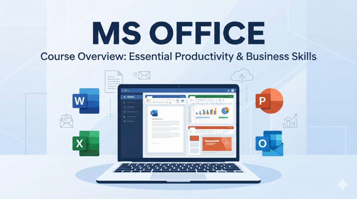 The Microsoft Office course teaches essential skills in MS Word, Excel, PowerPoint, and Outlook for creating documents, spreadsheets, and presentations. It is perfect for students and professionals who want to improve productivity and perform daily office tasks efficiently.">">